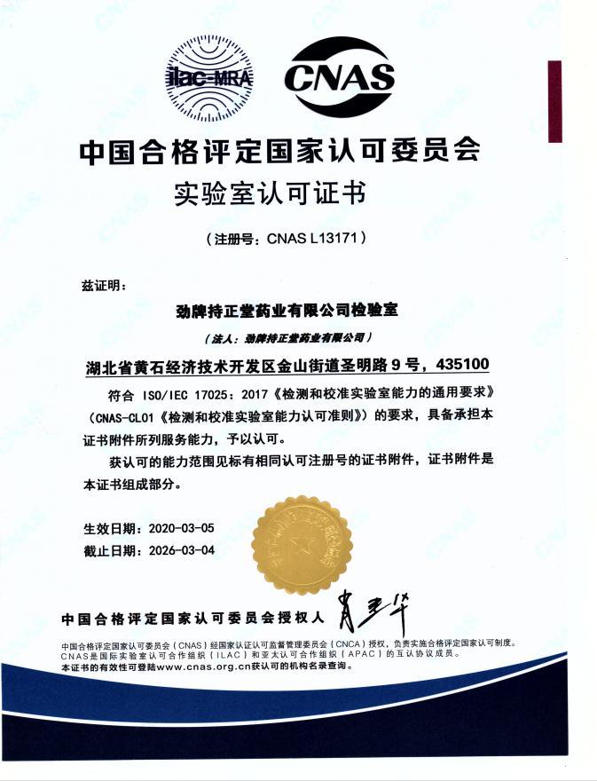 經過籌備與協調,檢驗室于2019年12月14-15日接受了中國合格評定國家認可委員會專家組的現場評審,經過質量管理體系運行情況審核、認可項目現場試驗技能考核,專家組一致推薦勁牌持正堂藥業檢驗室通過國家認可實驗室,檢測能力涉及藥品、純化水、藥用輔料等共12類對象159個檢測項目。中國合格評定國家認可委員會于2020年3月5日正式簽發CNAS證書。
